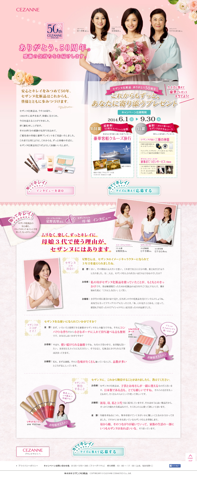 CEZANNE 50周年記念キャンペーン セザンヌ化粧品さまの50周年記念キャンペーンサイト制作をご担当させて頂きました。 キャンペーンデータの集計システムの構築までご担当させて頂き、本キャンペーンはご好評のうちに終了致しました。