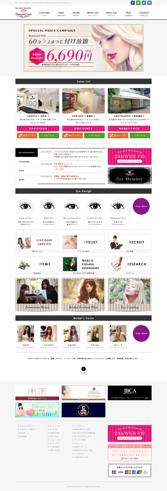 まつげエクステ専門店「Diamond Lash」 まつげエクステ専門店「Diamond Lash」のオフィシャルサイトを作成しました。 渋谷、新宿、表参道、恵比寿と多店舗展開されている企業様で、日々サイト上で情報を更新し、発信していく必要性が高い状況でした。 そのため、リニューアルの際には独自のCMSを納入し、管理アプリケーションにおいて、店舗情報、スタッフ情報、商品情報、実績などをクライアント様ご自身で即時更新できるような機能も提供致しました。