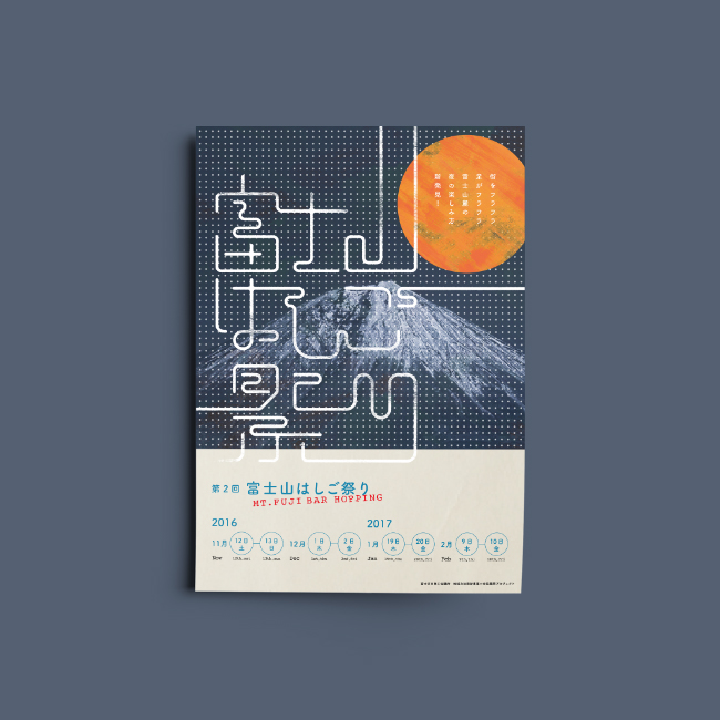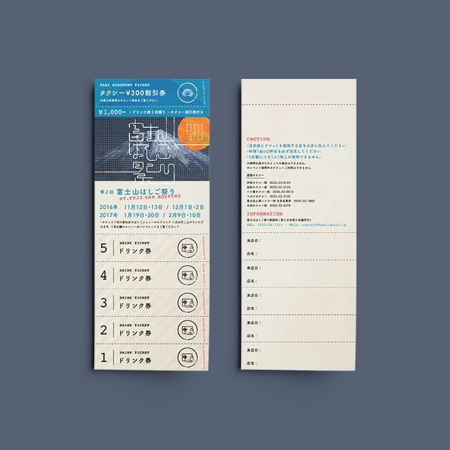 第2回 富士山はしご祭り 第1回に続き、第2回 富士山はしご祭りのポスター、パンフレット、チケットを作成しました。 富士山はしご祭りは山梨県富士吉田市で行われている、地元民向けの飲食店を「はしご」することを目的としたイベントになります。